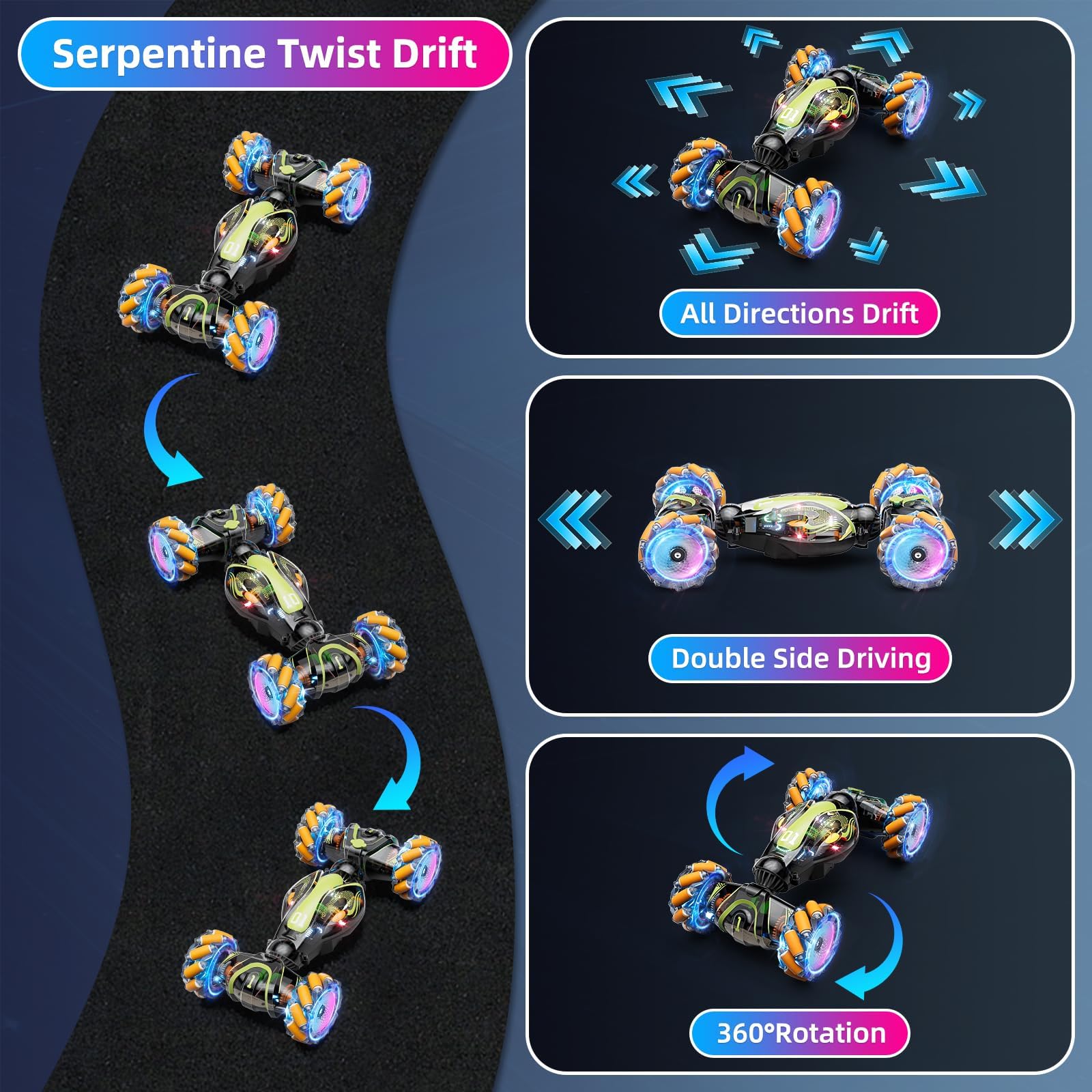 Meet the future of RC fun with the Gigilli Gesture Sensing RC Car! This isn't your average remote-control vehicle. Take full command with intuitive gesture control—simply move your hand to make the car drift, spin, and twist. Master spectacular stunts like multi-directional drifts, slick sideways moves, lightning-fast 360° spins, and even drive upside down with its double-sided design.