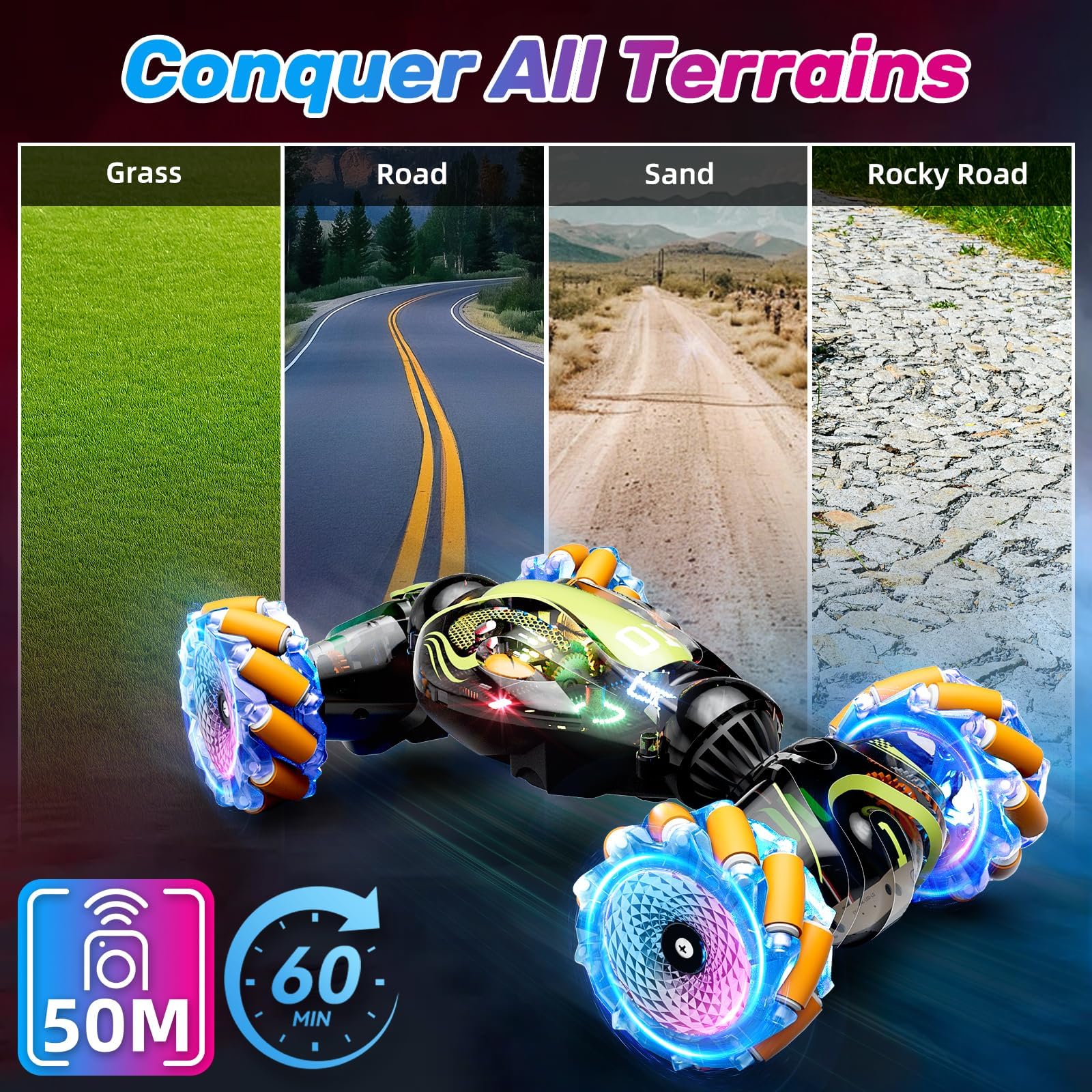Flexibility is key. Effortlessly switch between high-grip on-road and rugged off-road modes to conquer any surface. With an exciting DEMO mode that puts on an automatic stunt show, the fun never stops. Engineered for thrill-seekers of all ages, this 4WD stunt car delivers endless excitement and is the perfect gift to bring the whole family together for action-packed adventures.